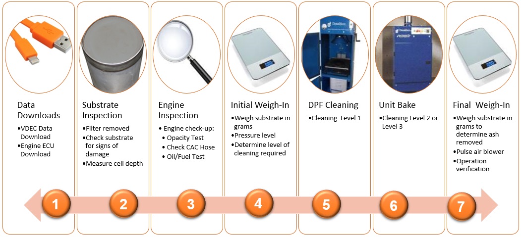 During the Durathon Service Process, the vehicle is subject to data downloads, engine health check-up and substrate cleaning. Pressure air pulse and heat are used in the substrate cleaning process to remove any diesel soot and ash to reopen the small air passages.